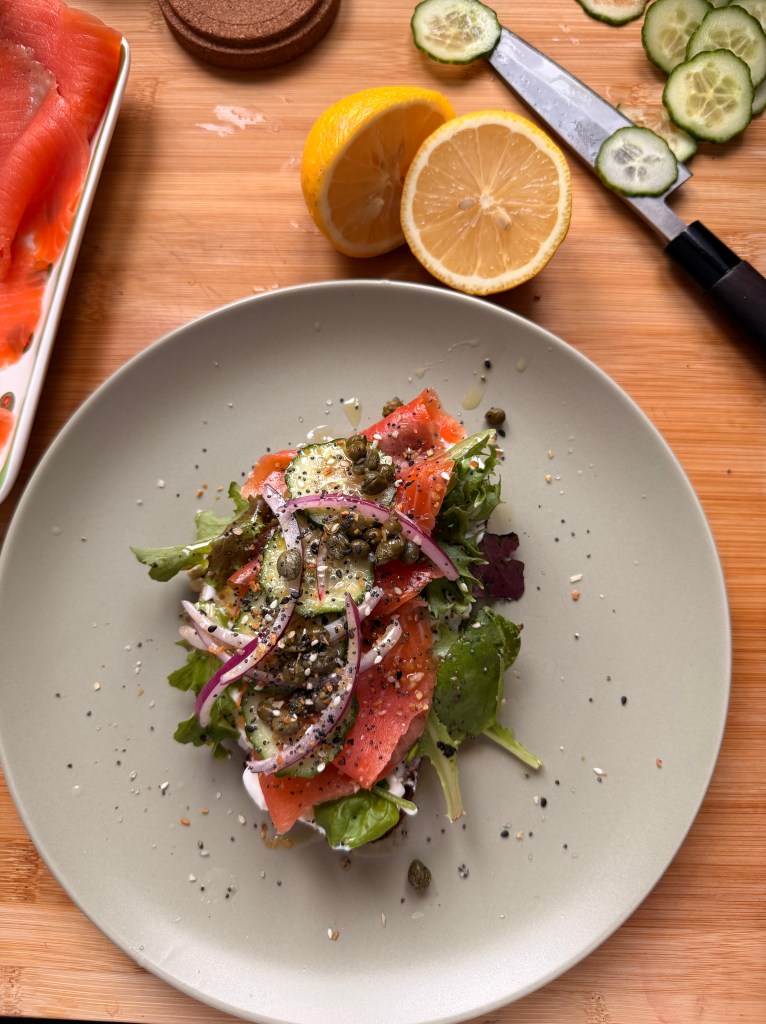 Toasted sourdough bread, whipped cottage cheese, smoked salmon, mixed lettuce, pickled Red onion, capers, cucumbers, lemon juice, olive oil, everything but bagel seasoning.