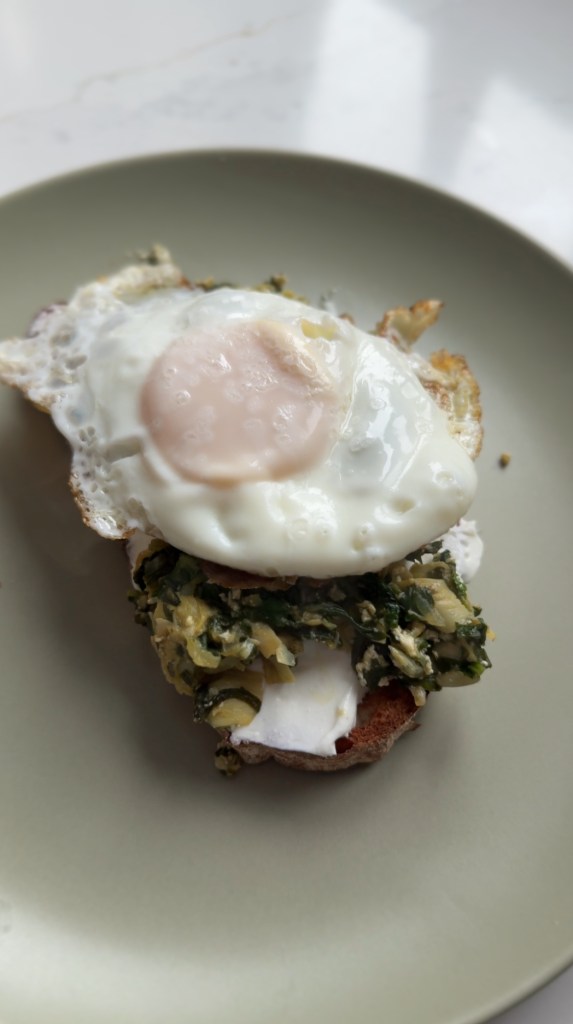 Toasted sourdough bread, whipped cottage cheese, spinach and artichoke dip, sunny side up egg on top.