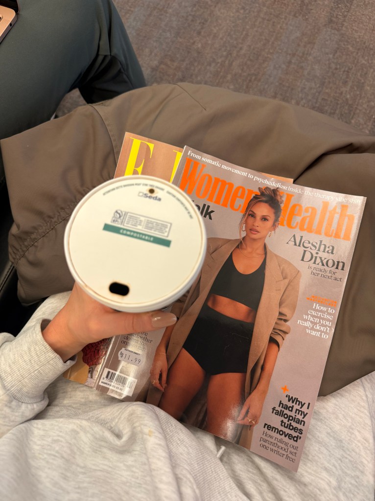 As I write this, I’m sitting at the airport gate, waiting for my zone to be called. A hot coffee in one hand, a stack of fashion magazines in the other—the same ritual I used to have every time I traveled, back before kids. There’s a peacefulness in this moment, a rare kind of stillness that feels almost foreign.