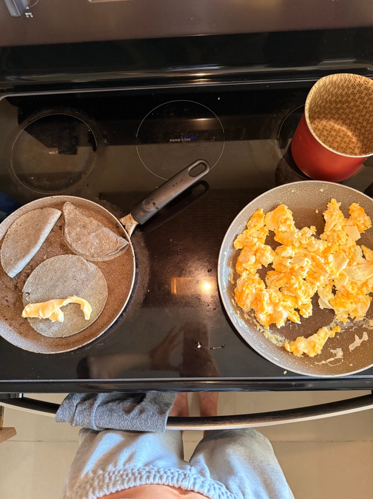 - Heat a pan over medium heat, add the avocado oil, and scramble the eggs until just cooked, making sure they stay soft and don’t dry out. Season with sea salt and set aside.