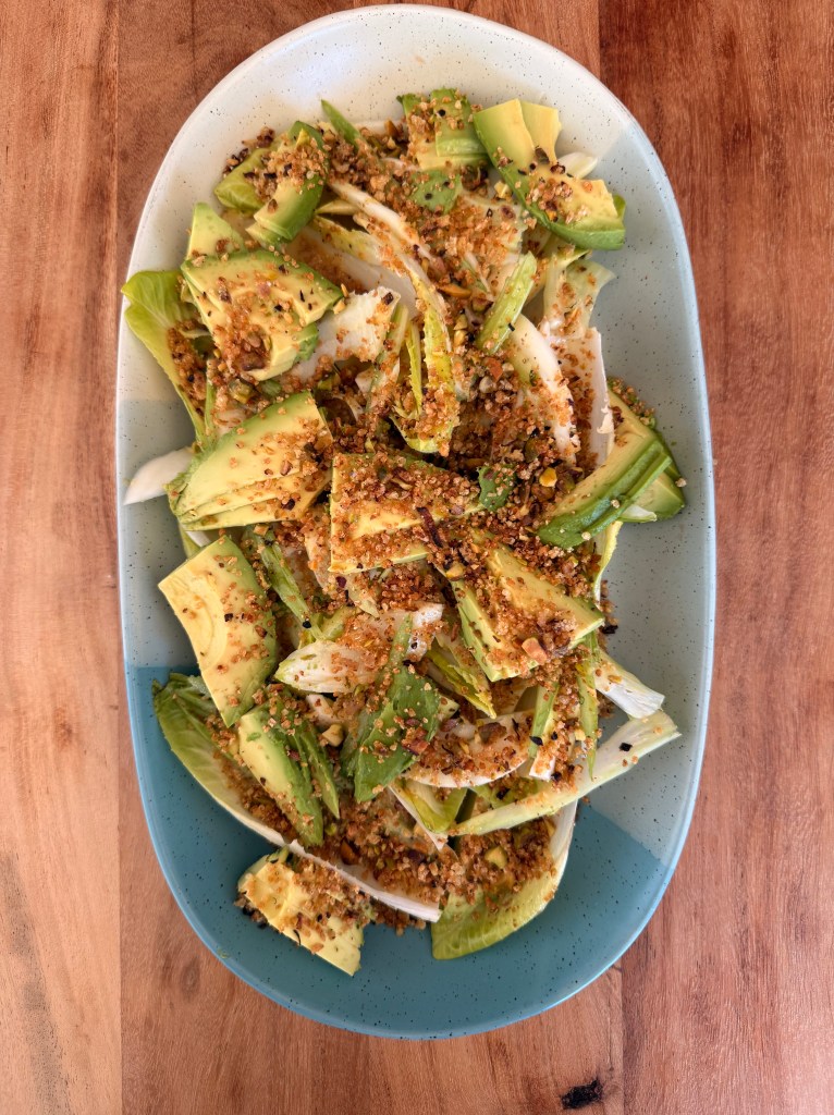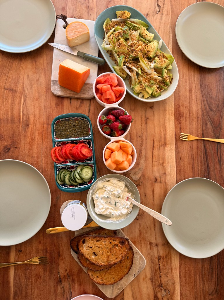 En la mesa, además del brioche, hubo fruta fresca (melón, sandía y fresas), pan de masa madre bien tostado, un plato surtido de carnes frías y salmón ahumado, quesos suaves como el Oka y el Gustav, y un untable que ya se volvió un favorito: labneh con cebollín, ajo, limón amarillo, sal y un chorrito generoso de aceite de oliva. También preparamos una ensalada crocante con endivias, hinojo, apio, aguacate, un crumble de panko con pistaches y aderezo de mostaza y miel.