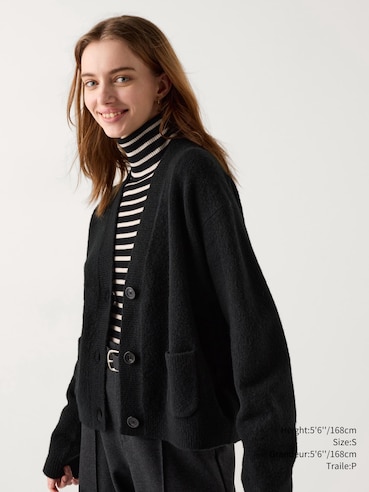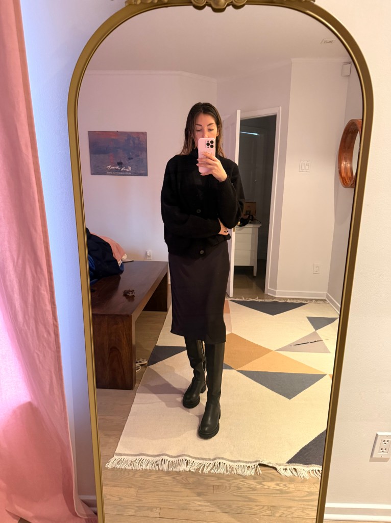 That’s when I spotted her—my black satin slip dress. Sleek, slinky, quietly sensual. The perfect answer to the “texture contrast” part of the equation. I layered it over the turtleneck for warmth (Montreal spring is still a little shy) and threw on a soft, almost cloud-like cardigan from Uniqlo—scored on a mega sale, might I add.