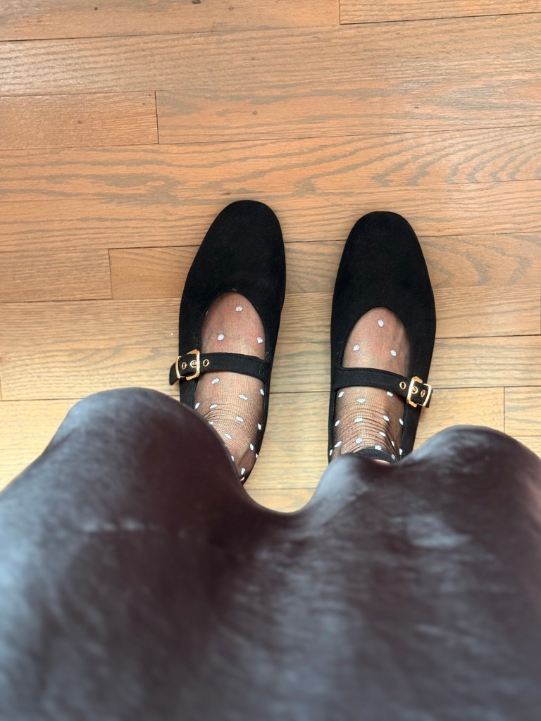 Then came the fun part: shoes. I tried knee-high boots first, but they felt too wintry. Then black tights with Mary Janes and sheer polka-dot socks—a look that veered into retro grandma territory. Not quite the vibe. So I ditched the tights, let a little skin peek through, and voilà! The outfit finally came together.