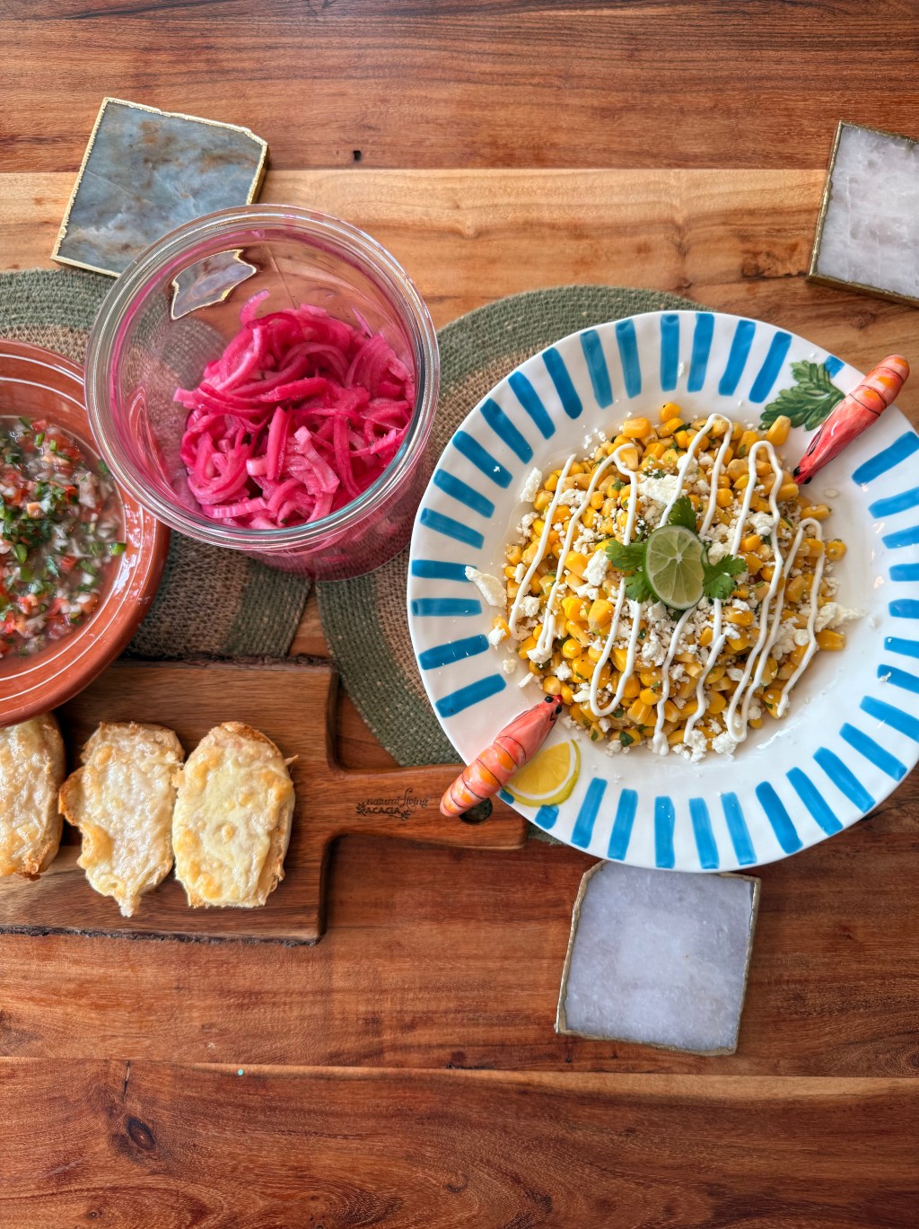 We also had refried beans, pickled onions, and a fresh corn salad made with corn, lime, cilantro, salt, and feta cheese. There were homemade totopos, and a fruit platter with pineapple, watermelon, melon, and mandarins.