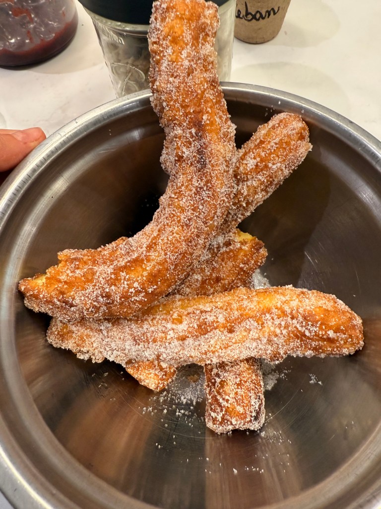 For dessert, we had churros and flan, two of the most classic Mexican sweets. Churros are fried dough rolled in cinnamon sugar, and flan is a smooth caramel custard that melts in your mouth. We also served chocolate caliente, made with cacao I brought back from Mexico.