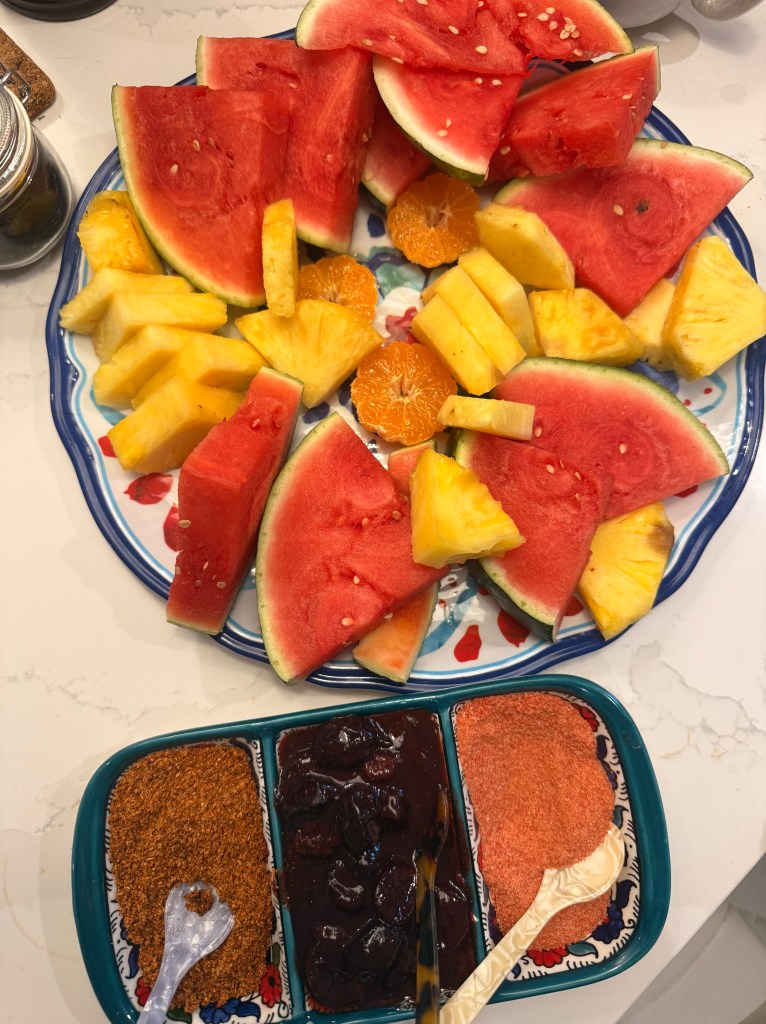 And because it wouldn’t be a Mexican table without it, we added chamoy—a sweet and spicy candy sauce, Tajín—a chili-lime seasoning that we put on everything, and Miguelito—a tangy, spicy candy in powder form that we love to sprinkle over fruit and vegetables.