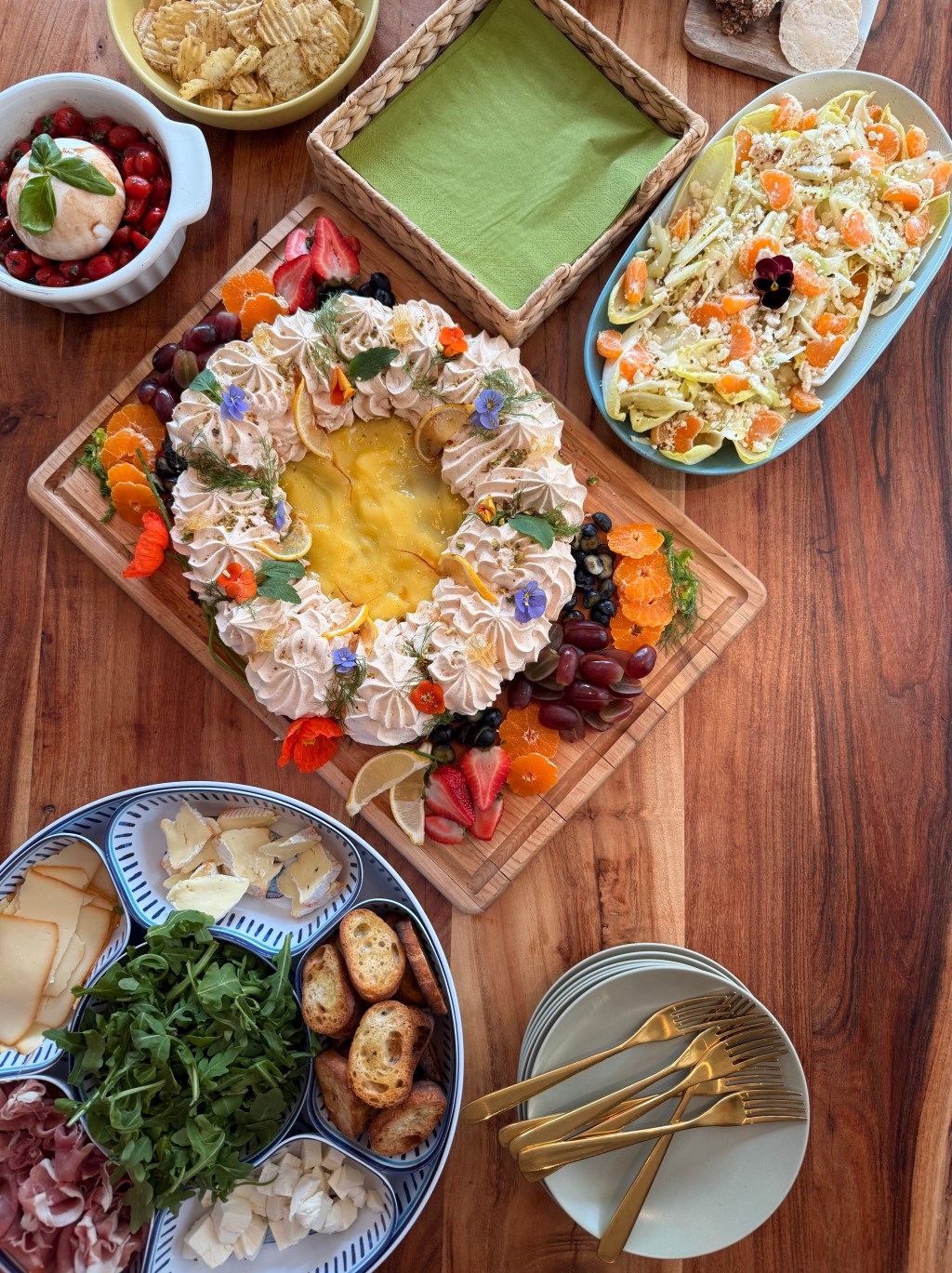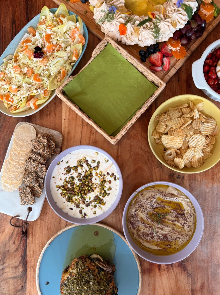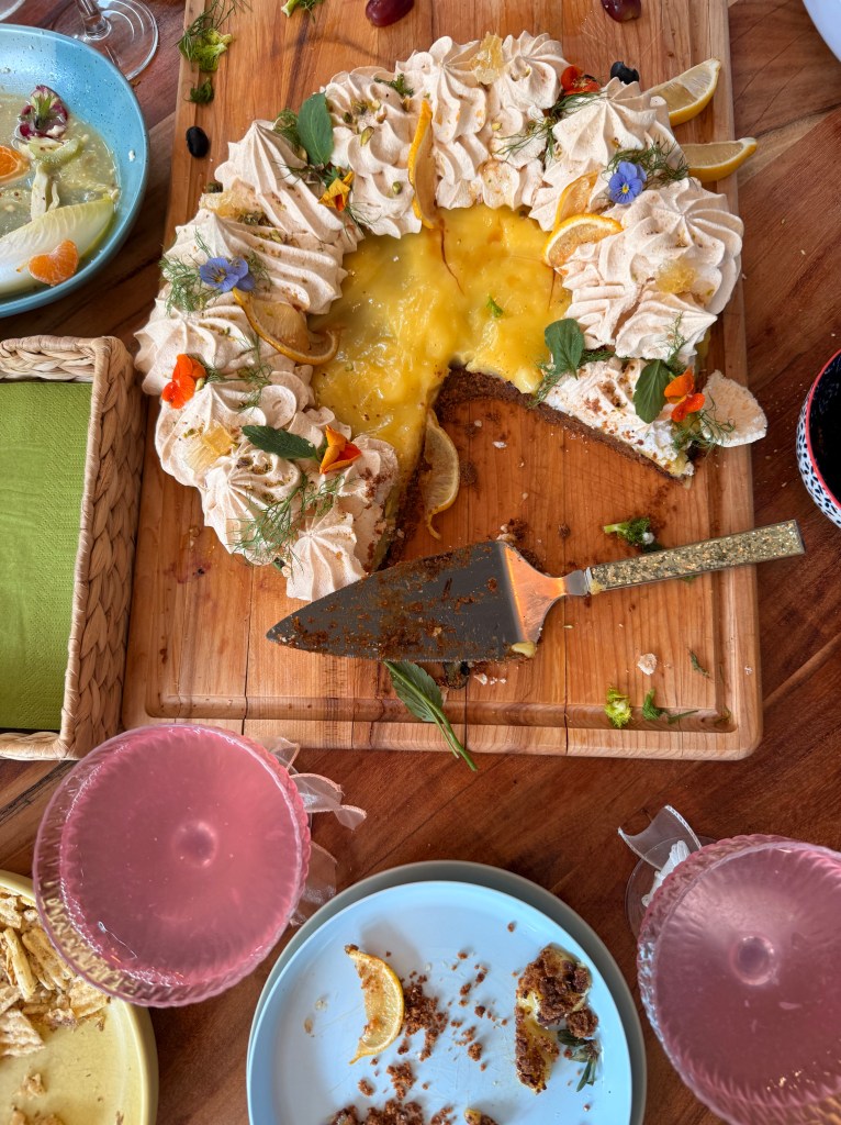 My parents are still visiting, so of course, I recruited my mom. She’s a magician in the kitchen and wildly artistic, so I gave her a challenge: make a lemon tart topped with pavlova. I had seen the inspiration on Instagram—fluffy, floral, and golden—and she took it from there. I also texted my friend Christine, a literal garden queen, and asked if I could “borrow” some of her edible flowers. She delivered, as always.