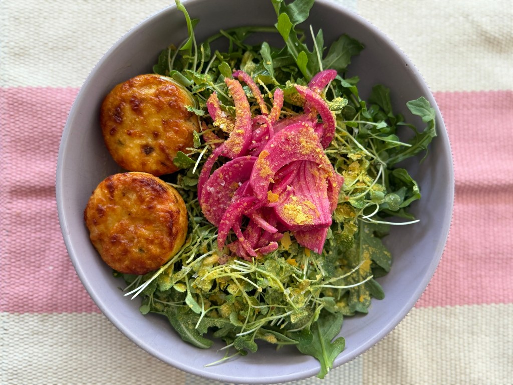 Next—I love a vibrant, gut-friendly salad. Think peppery arugula, tender sprouts, pickled onions, a simple lemon-olive oil dressing, and a sprinkle of nutritional yeast for B-vitamins and savory depth. Paired with jalapeño cheddar egg-white muffins (eggs, shredded cheddar, diced jalapeño, sauteed onions in ghee, ricotta, salt, and pepper), this combo is quick, flavorful, and nutritious.