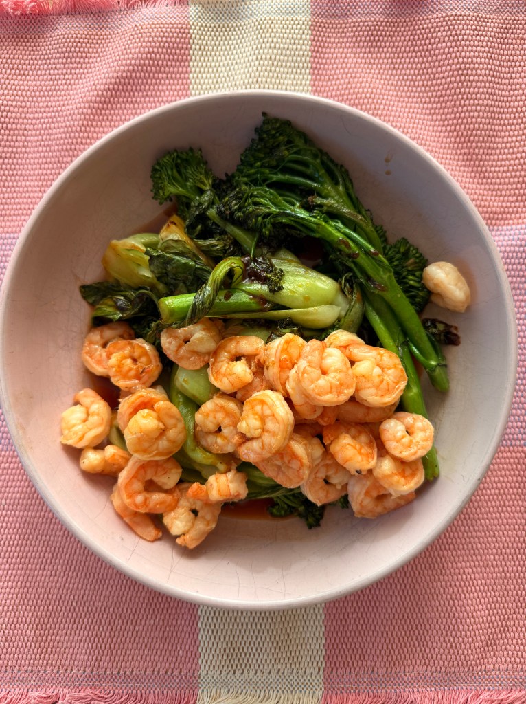 | Wednesday PM | BBQ-shrimp + seared bok choy + broccolini | Lean protein, cruciferous greens, vitamins A+C |