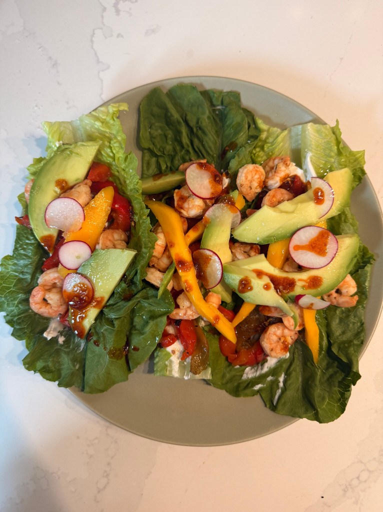 Finally, a dinner that hits all the notes: shrimp tacos, but wrapped in romaine lettuce. The shrimp are marinated in Cajun spice, quickly seared, and squeezed with lemon. I spread labneh on the lettuce, then add store-bought roasted peppers, shrimp, fresh avocado, mango slices, and sliced radish. A squeeze of lime and a sprinkle of spicy miso-chili sauce finishes it.