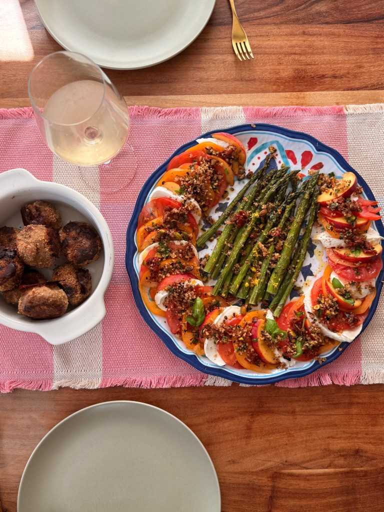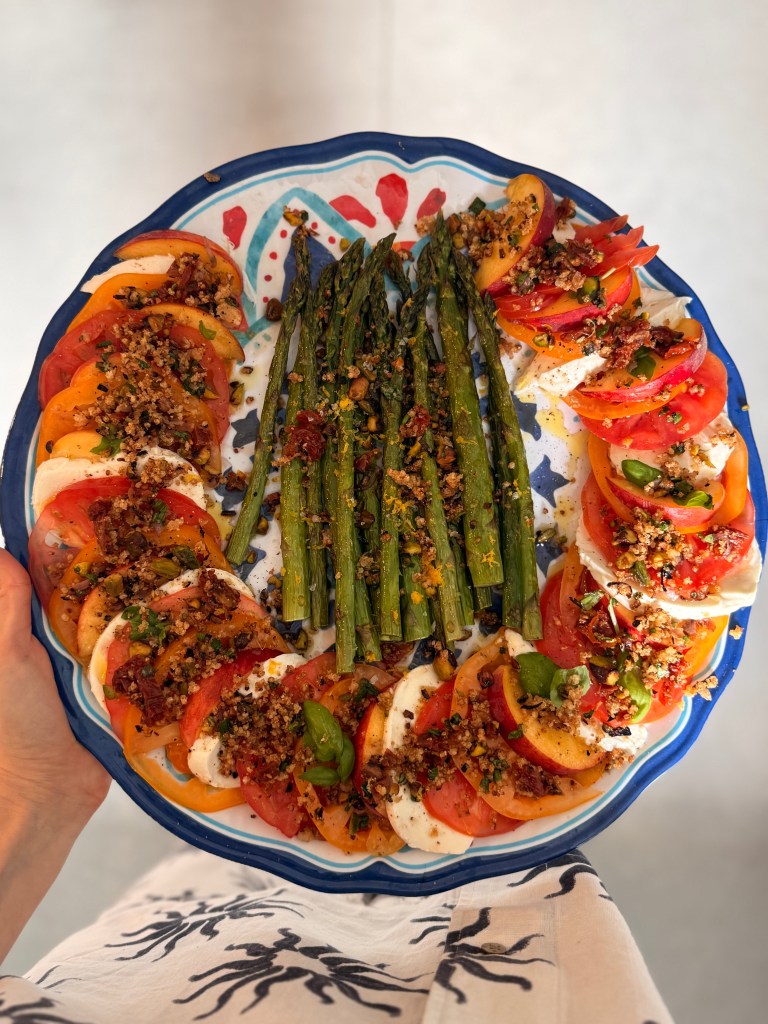 Salad: Juicy heirloom tomatoes and ripe peaches layered with creamy fresh mozzarella. On the side: roasted asparagus with lemon zest, gluten-free panko, and pistachio crumbs.