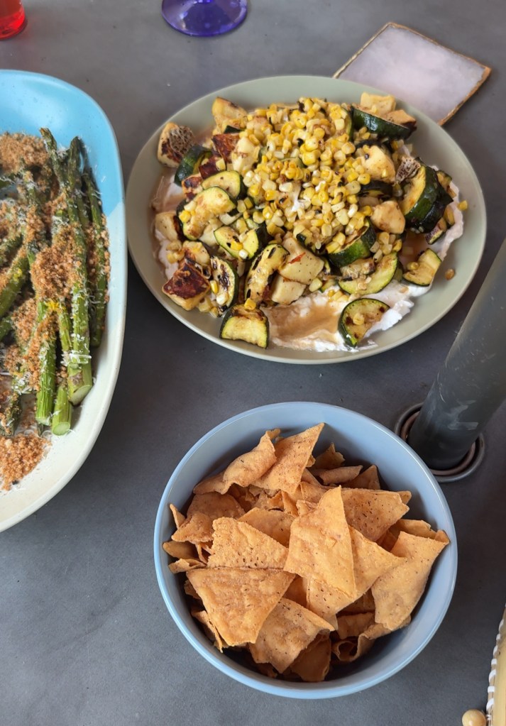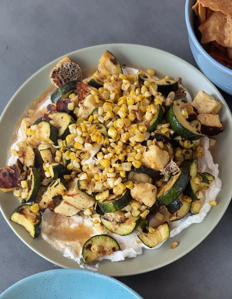 - To serve, spread a generous layer of labneh on the bottom of a shallow bowl or serving platter. Top with the grilled veggie mixture.